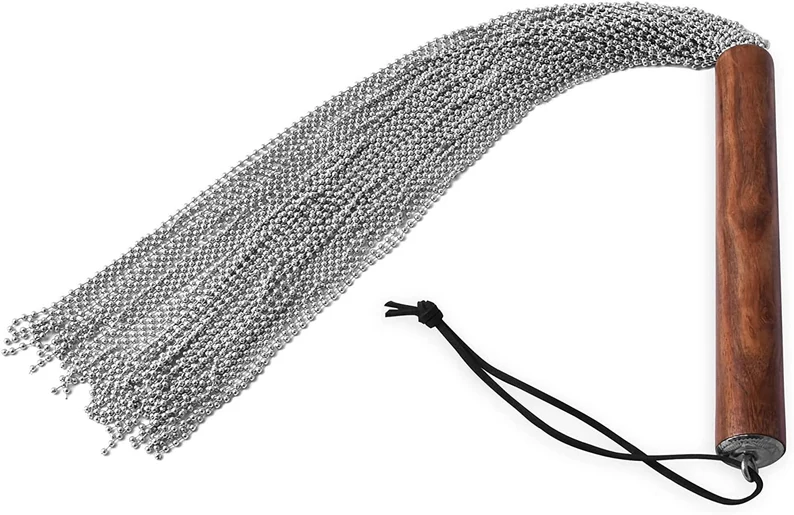The gag wasn’t terribly uncomfortable at the moment, but I could see where it would be if opened wider. I bent over his desk where he attached ankle cuffs and anchored them to the legs of his desk. Then, he showed me what he would be using. I paled. a flogger made of metal beads.